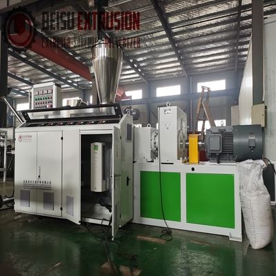 BEISU Plastic PVC pelletizing Conical twin-screw air-cooled hot-cut granulator is mainly used for hot-cut granulation and extrusion of powder plastics such as PVC+CaCo calcium carbonate into granules. It has the characteristics of low shear rate, uniform plasticizing and mixing, high output and stable quality.